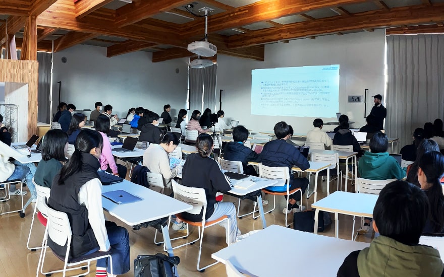 瀬戸内海に浮かぶ大崎上島にある広島叡智学園での説明会。外国人留学生も多い国際色豊かな学校の特徴もあり、奨学金の対象となる日本人の生徒の方に数多く参加いただきました。