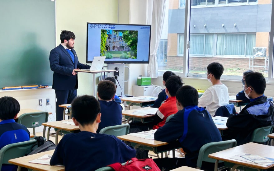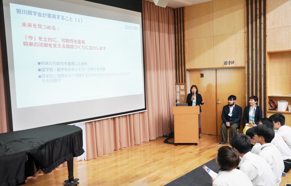 笹川平和財団では、全国の高等学校・中学校等を訪問して、笹川奨学金の説明会を開催しています。