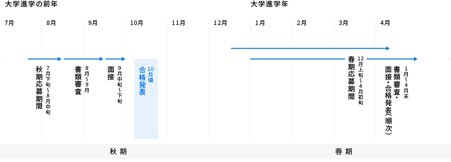 本奨学金では秋期(大学出願前)と春期(大学出願後)の2回、